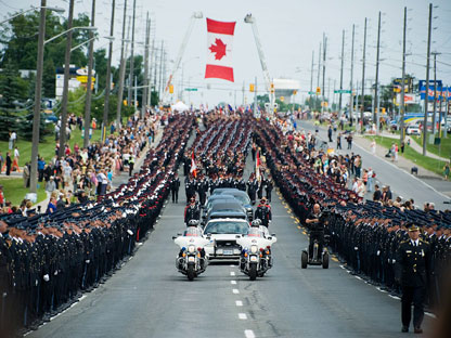 當(dāng)靈車(chē)及護(hù)送車(chē)隊(duì)抵達(dá)位于NewMarket的Upper Canada Mall后,在該處集合的逾六千名加、美兩國(guó)警隊(duì)警察、約克區(qū)消防和救護(hù)隊(duì)員及加國(guó)軍人,便開(kāi)始沿著央街(Yonge St)兩側(cè)以整齊的方陣列隊(duì),向尾隨的靈車(chē)及護(hù)送車(chē)隊(duì)致敬。靈車(chē)及護(hù)送車(chē)隊(duì)最后駛到葬禮的舉行地點(diǎn)Ray Twinney Recreation Complex康體中心。