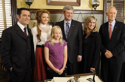 總理哈珀(右三)和他的女兒瑞奇(前)與電視劇集《莫多克偵探》的演職員合影。由哈珀客串劇中警察角色的一集,將在本月20日播出。