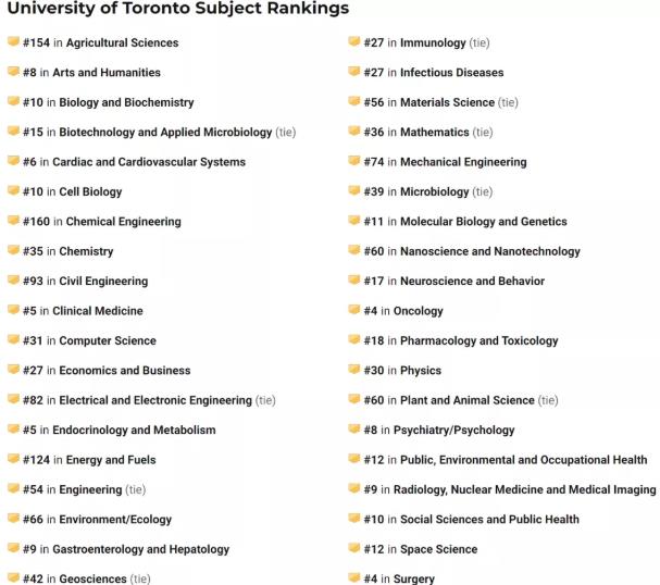 多倫多大學各大學科在世界的排名