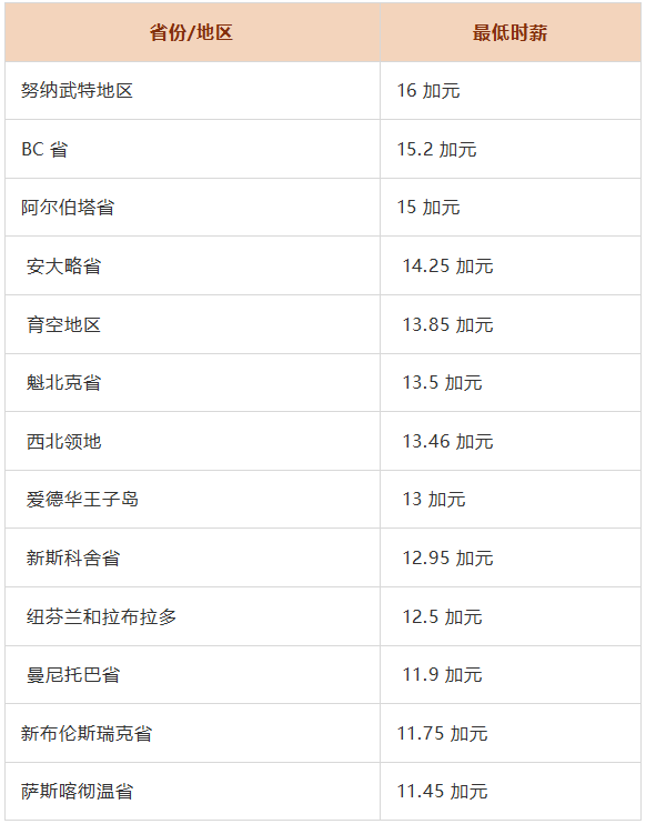 截止至2021年6月,加拿大各省最低時薪分別為: