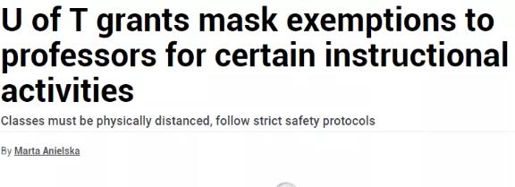 根據(jù)多倫多大學校報報道,隨著“課堂教學”的開始以及逐步推廣到大部分課程,多倫多大學已允許其學術(shù)部門向一部分教授授予教學活動的“口罩豁免權(quán)力”,只要他們遵守安全協(xié)議并能證明他們有合理的理由申請豁免權(quán)。