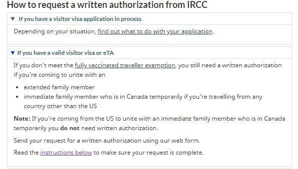 對于已經(jīng)擁有訪問簽證符合申請條件者,如果你沒有達(dá)到加拿大要求的完全接種過疫苗的旅客豁免標(biāo)準(zhǔn),如果你要和一個大家庭成員、與在加拿大以非居民身份的直系親屬從美國以外的任何國家旅行,注意:如果你從美國與加拿大非居民的直系親屬團(tuán)聚,你不需要書面授權(quán)。