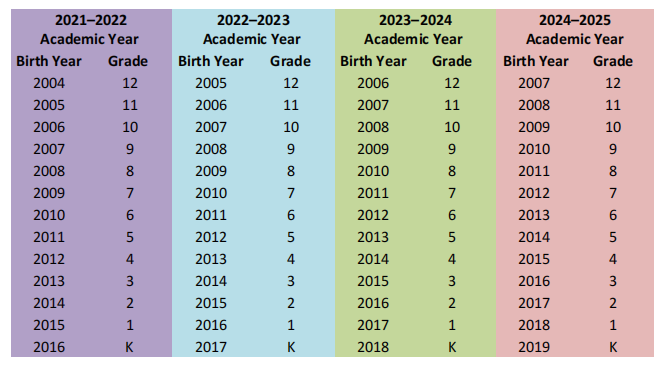 溫哥華教育局會(huì)按照學(xué)生的年齡及成績(jī), 根據(jù)如下年齡-年級(jí)對(duì)應(yīng)表, 學(xué)生截止于12月31日的年齡, 為學(xué)生安排適當(dāng)?shù)募?jí)別: