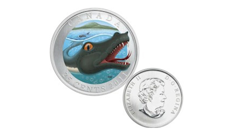 魁北克湖怪門弗雷(Memphre)活現人間﹐現身全彩色的加拿大25仙硬幣?!?/p>